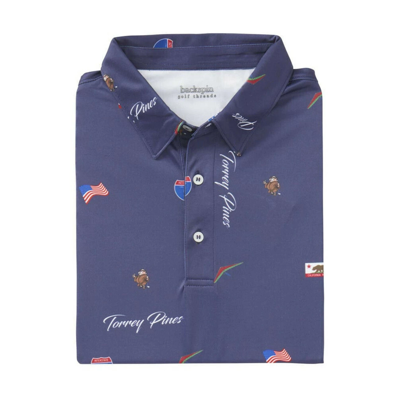 Backspin Torrey Pines Polo pays homage to the world famous golf course with bold and fun designs throughout. The stretch fabric polo features a triple button placket and self collar for a classic look and timeless style.