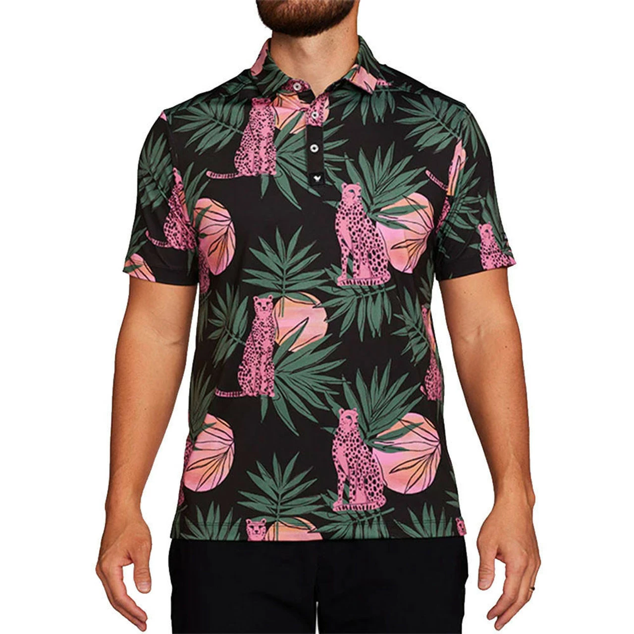 This polo is giving off “it’s called Sex Panther by Odeon. It’s illegal in nine countries… Yep, it’s made with bits of real panther, so you know it’s good” vibes. And rightfully so. Walk onto the course in this one and see what happens. This golf polo is an athletic, trim fit, palm print cheetah pattern polo packed with performance technology to help you feel your best and play your best out on the golf course.