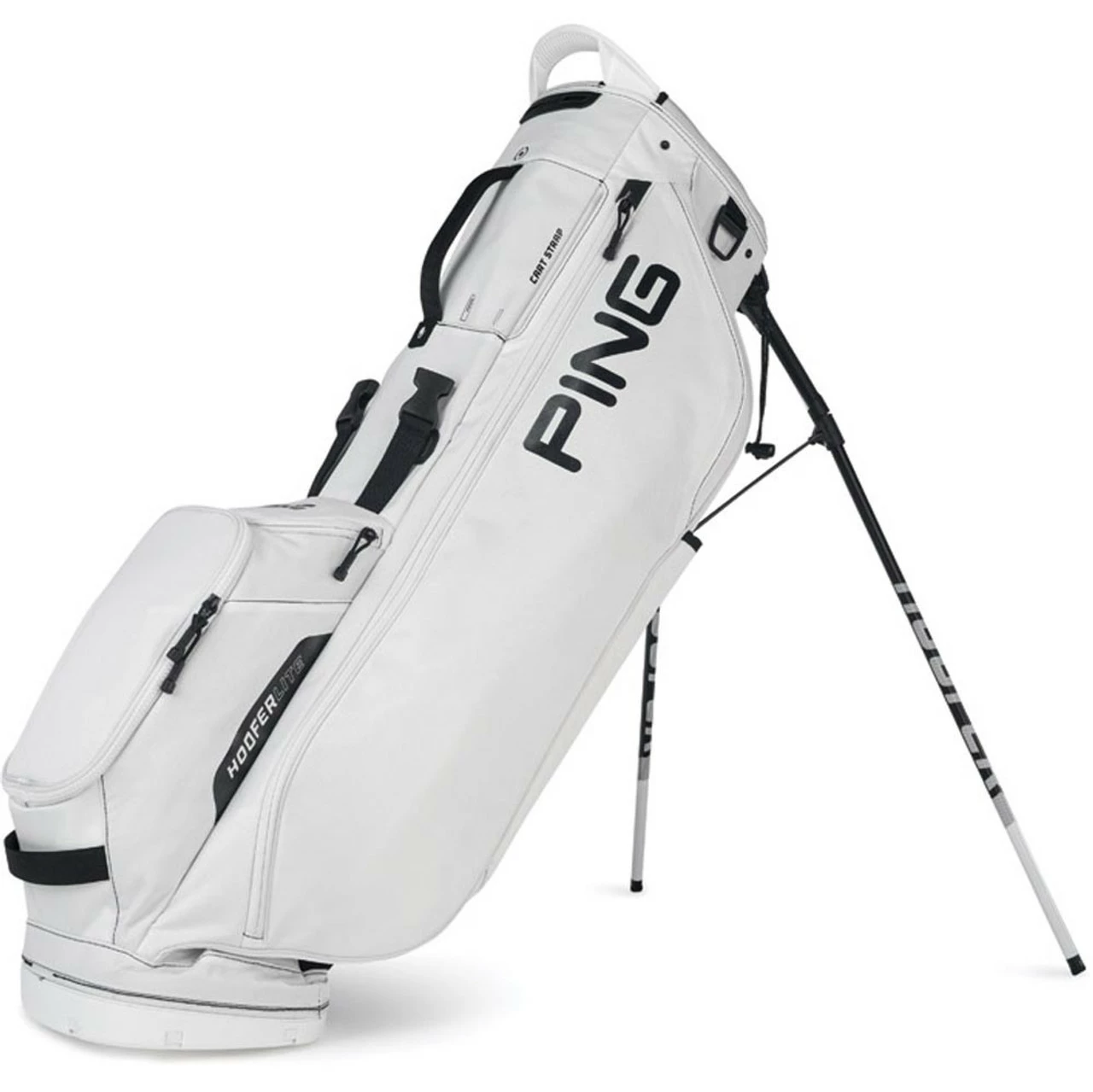 Do not take this bag lightly, even though it only weights 5 lbs. The Hoofer Lite by Ping is well made and has plenty of storage. If you do decide to ride, there is a cart-strap pass-through channel which is hidden and doesn’t interfere with pockets. There’s seven pockets in all including a full-length apparel pouch, an easy access valuable pocket, a place for your range finder, and a zip-off ball pocket. The double convertible straps can be converted to a single, depending on how the player likes to carry.Â